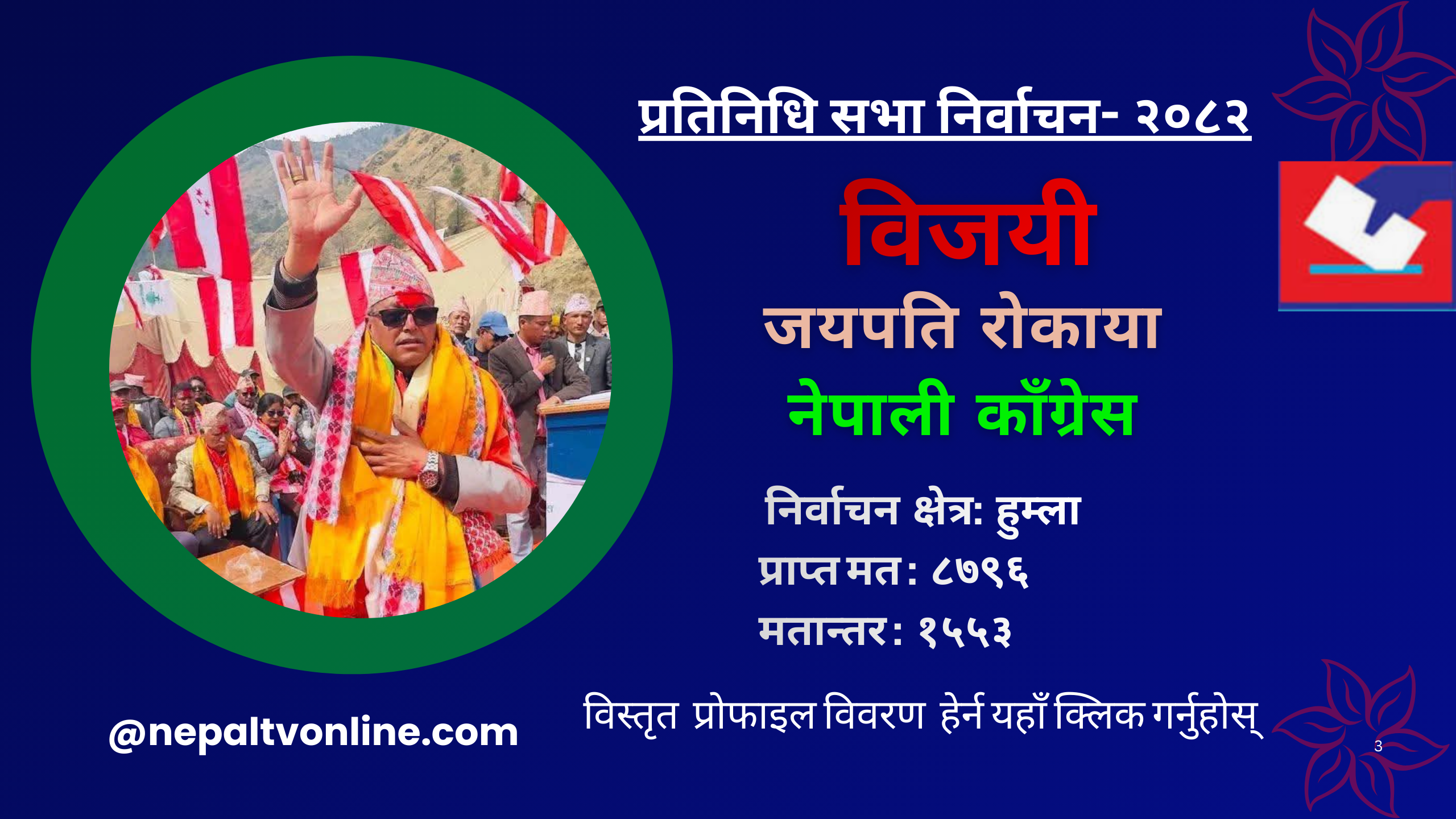 हुम्ला- प्रतिनिधिसभातर्फ एकमात्र निर्वाचन क्षेत्र रहेको हुम्लामा नेपाली कांग्रेसका उम्मेदवार जयपति रोकाया निर्वाचित हुनुभएको छ ।